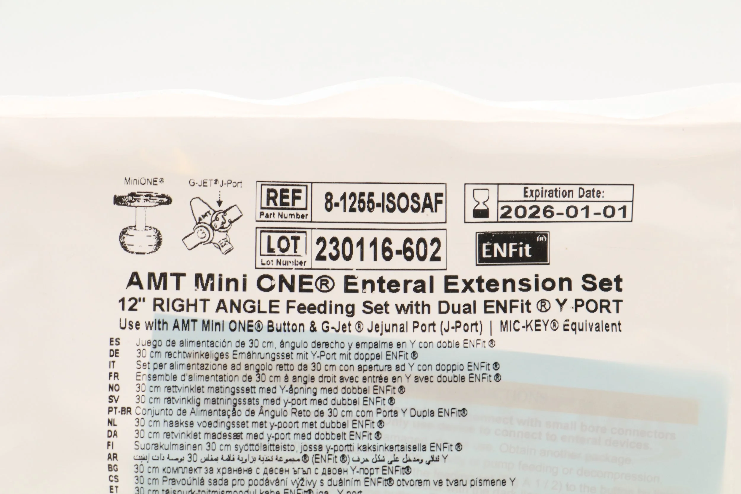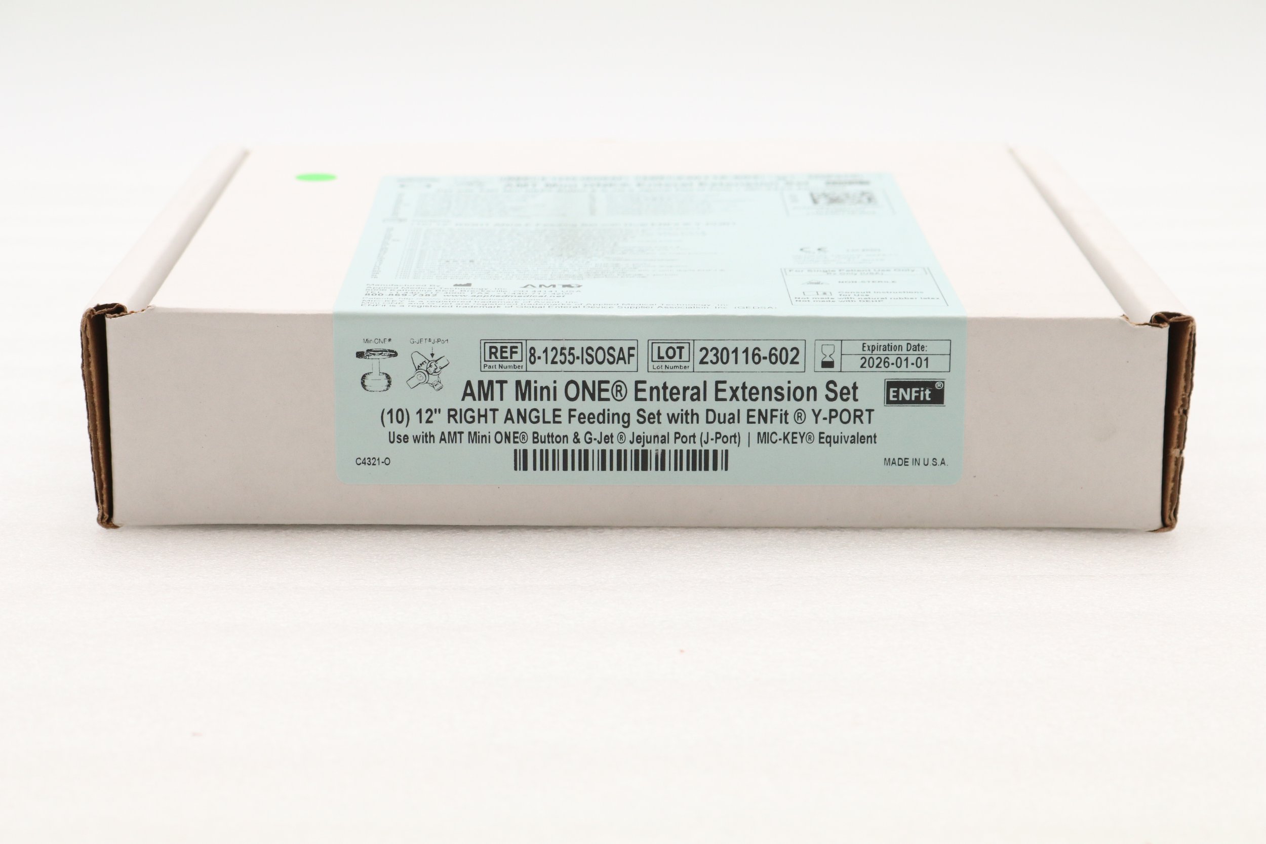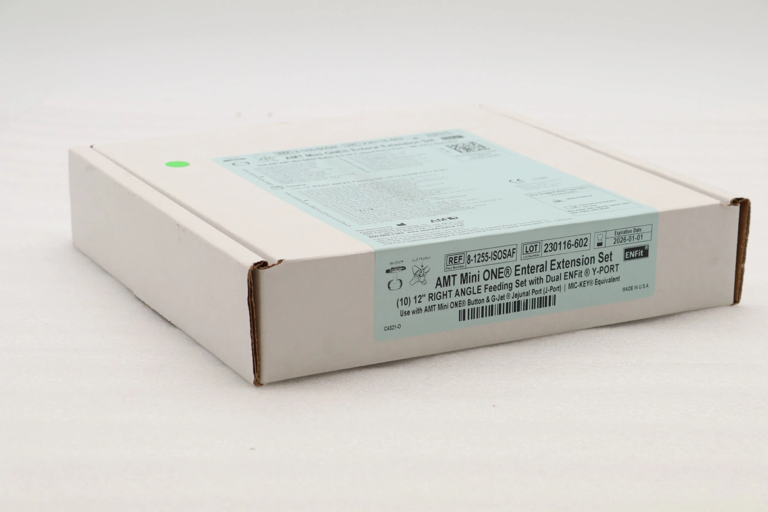 Applied Medical Technology | 8-1255-ISOSAF | SHORT DATE | BOX OF 10 | MiniONE Feed Sets & G-JET Jejunal Feed Sets (Prepared for ENFit) - 12" Right Angle Connector with Dual Male ENFit & TRN203