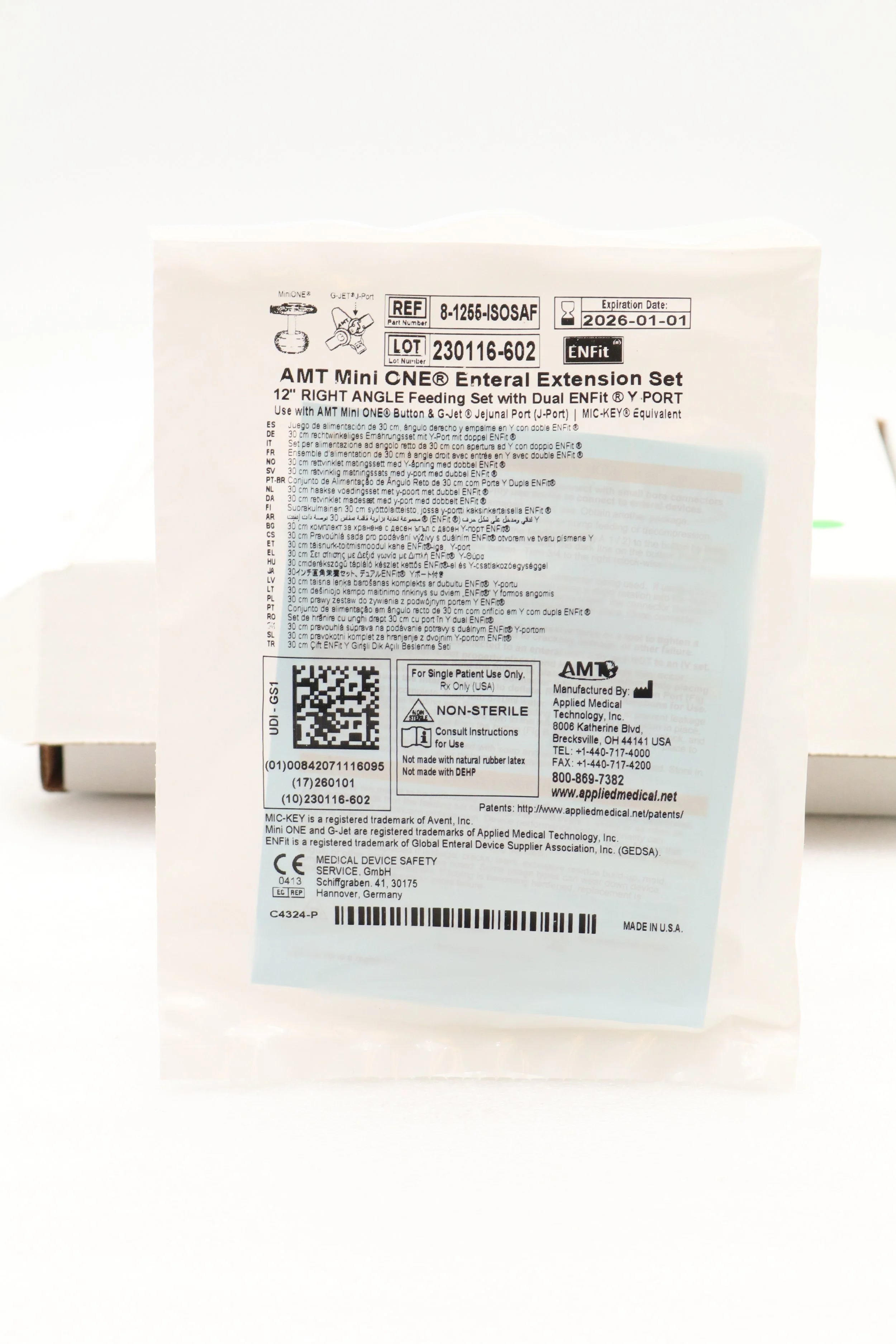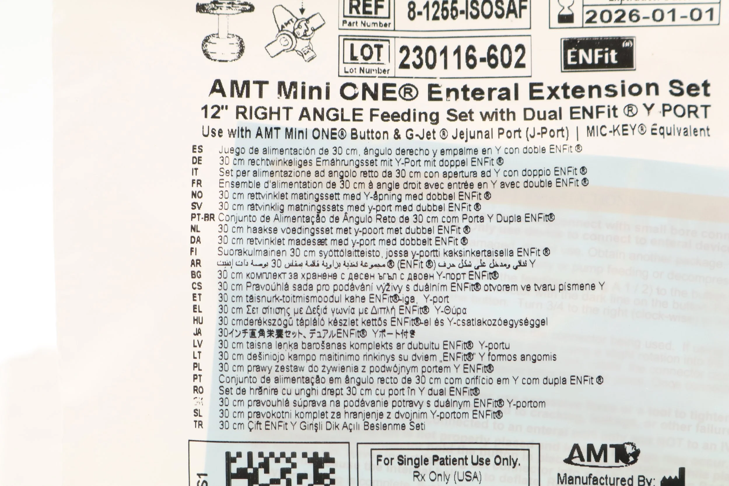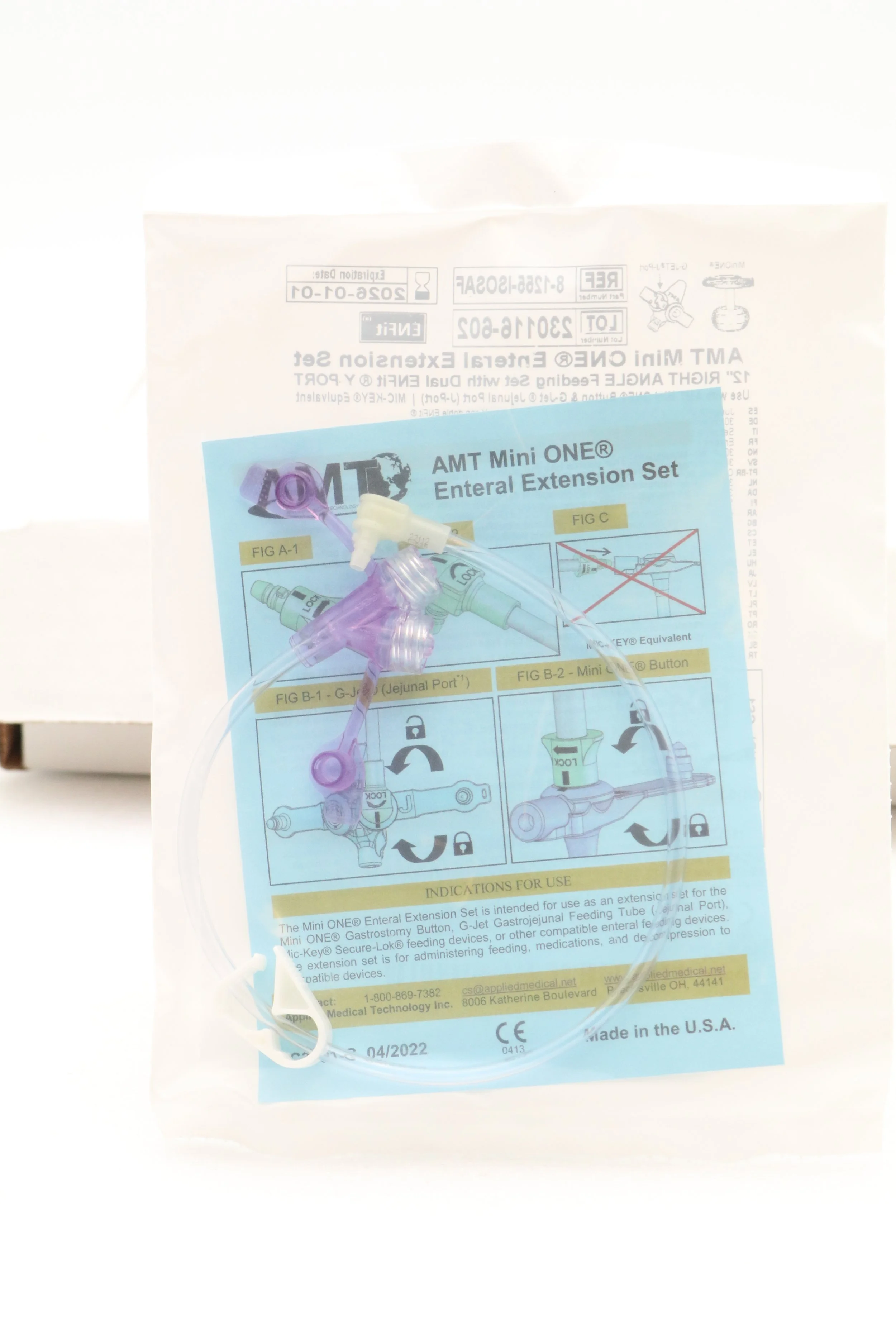 Applied Medical Technology | 8-1255-ISOSAF | SHORT DATE | BOX OF 10 | MiniONE Feed Sets & G-JET Jejunal Feed Sets (Prepared for ENFit) - 12" Right Angle Connector with Dual Male ENFit & TRN203