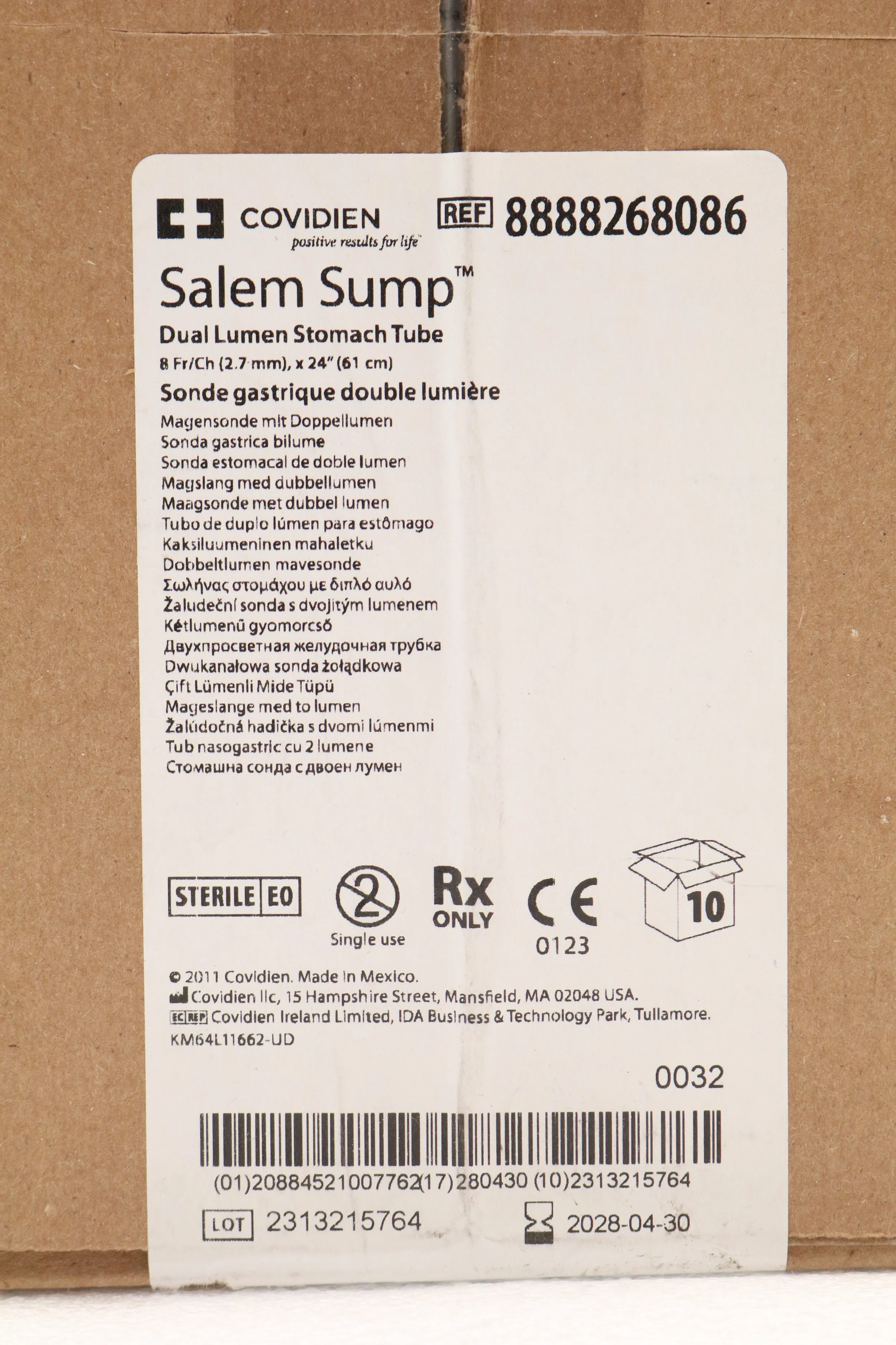 Covidien | 8888268086 | IN-DATE | BOX OF 10 | TUBE, SUMP, SALEM, 8FR, W/FUNNEL