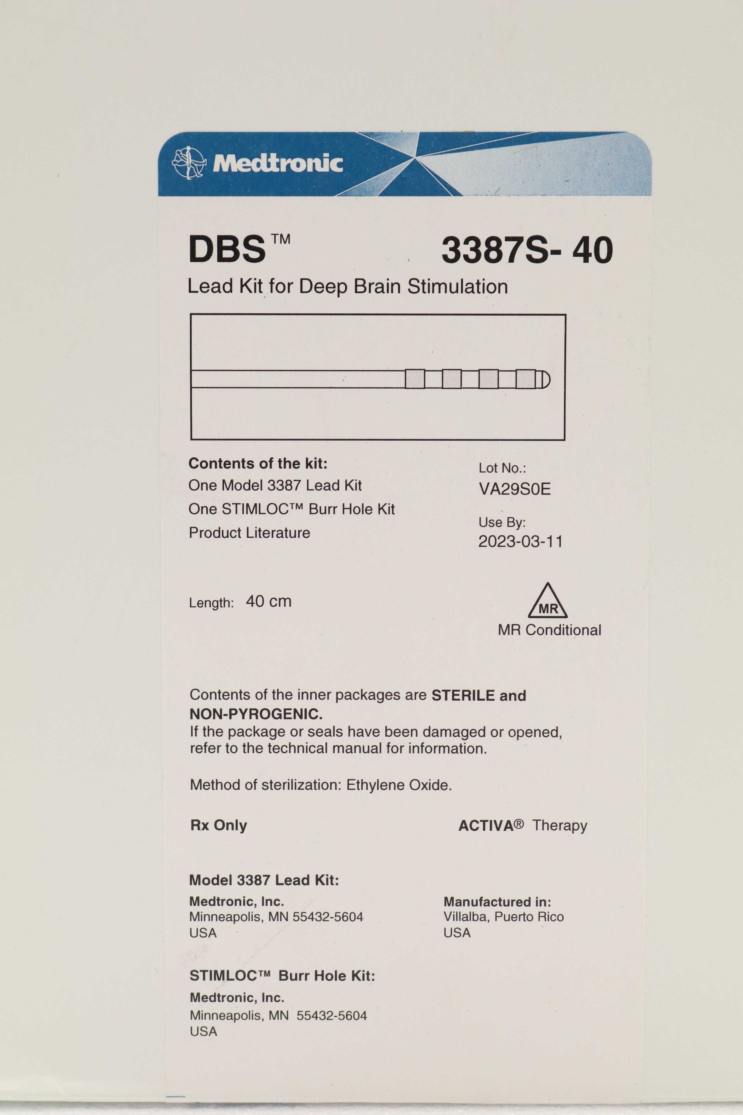 Medtronic | 3387S-40 | EXPIRED | EACHES | Lead Kit for Deep Brain Stimulation (DBS) 40cm w/StimLoc Burr Hole Kit