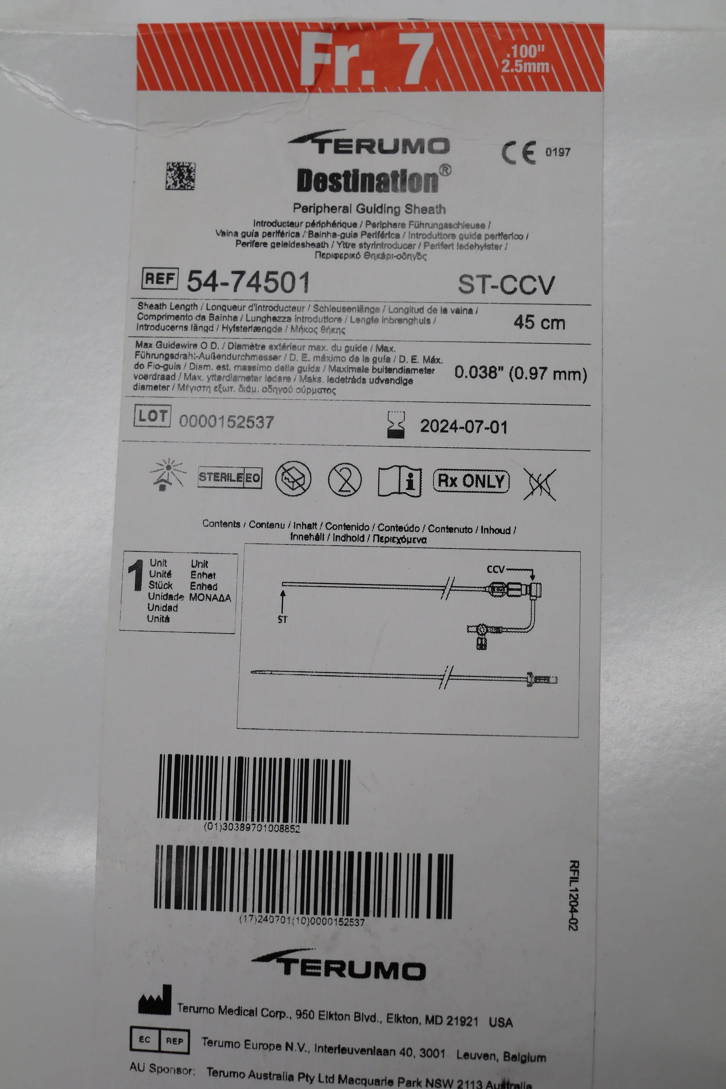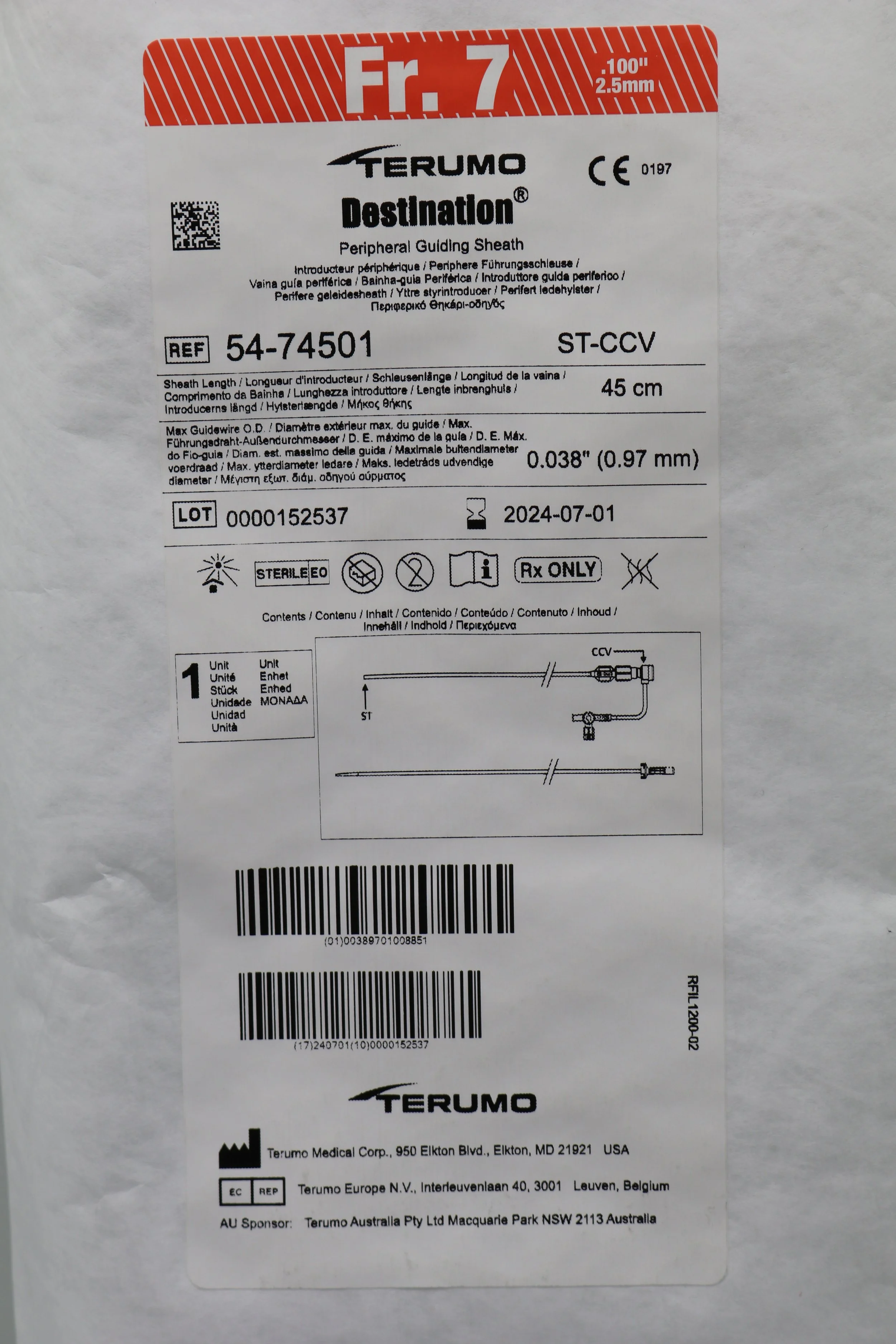 Terumo | 54-74501 | EXPIRED | EACHES | Pinnacle Destination Peripheral Guiding Sheath 7Fr, 45cm x 35cm, Cross-Cut, Straight