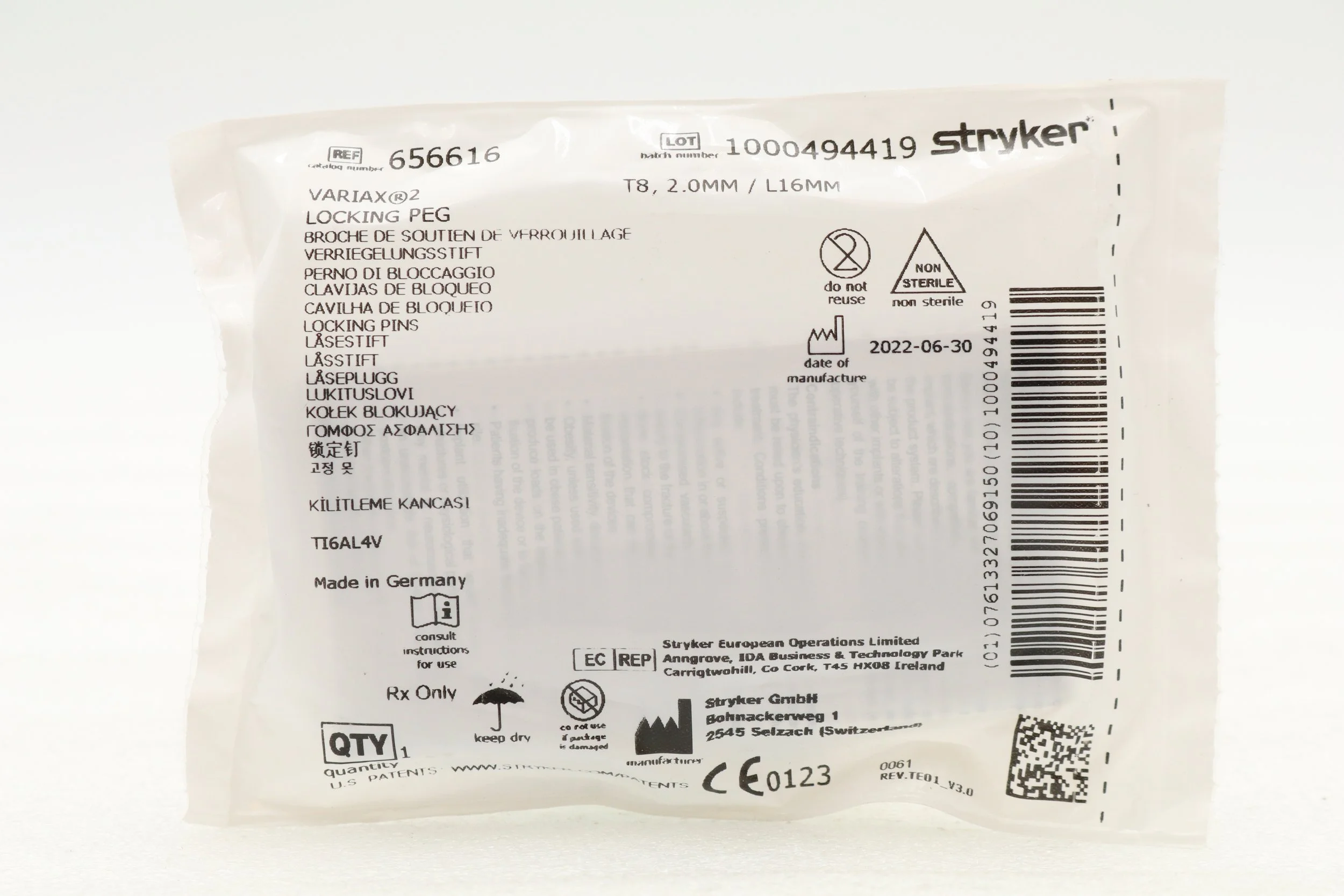 STRYKER | 656616 | NO DATE | EACHES | VariAx 2 T8 Locking Peg 2.0mm x 16mm