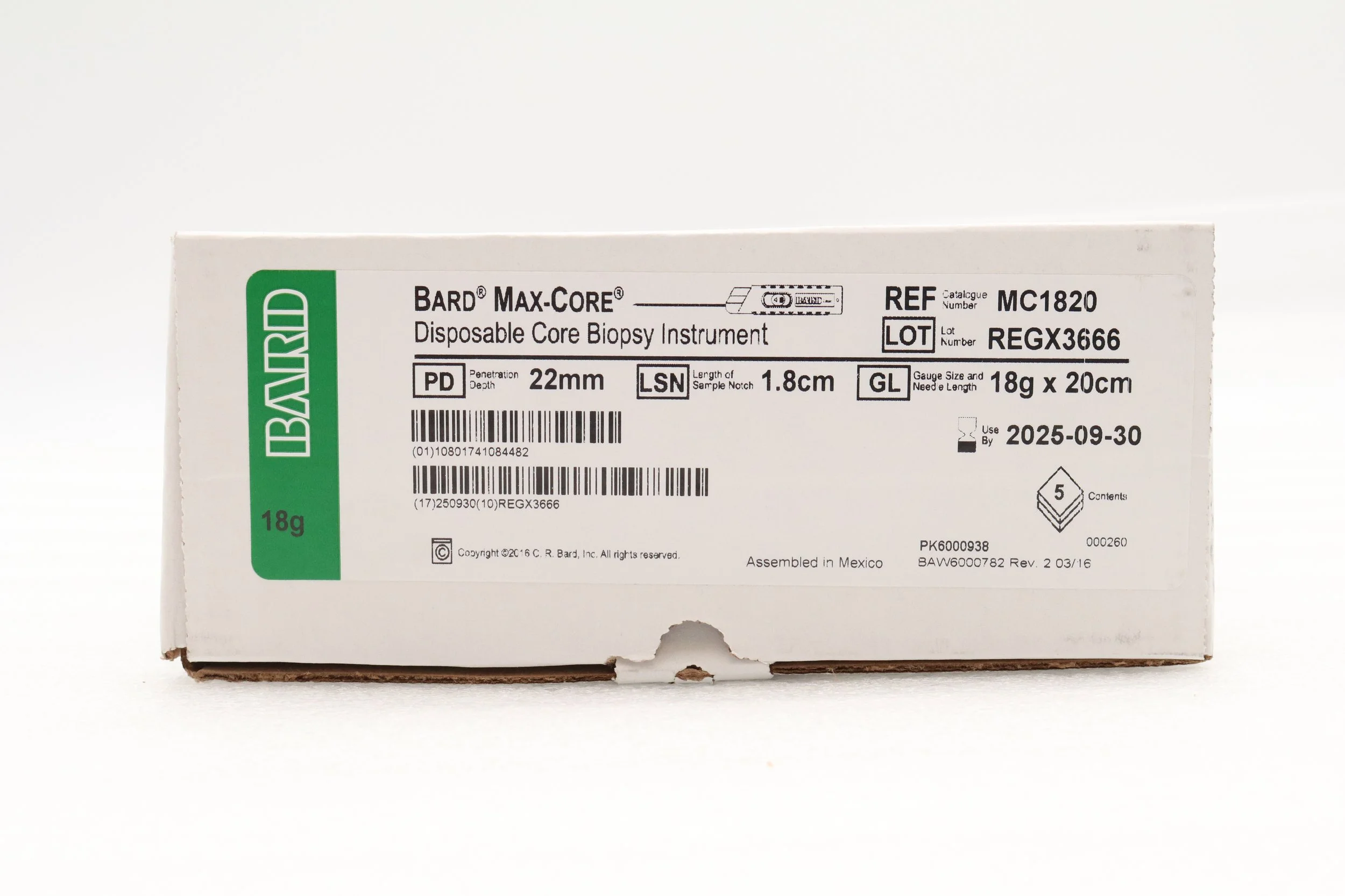 BARD | MC1820 | BOX OF 5 | MAX-CORE DISPOSABLE CORE BIOPSY INSTRUMENT, 22MM PENETRATION, 18G X 20CM, 1.8CM