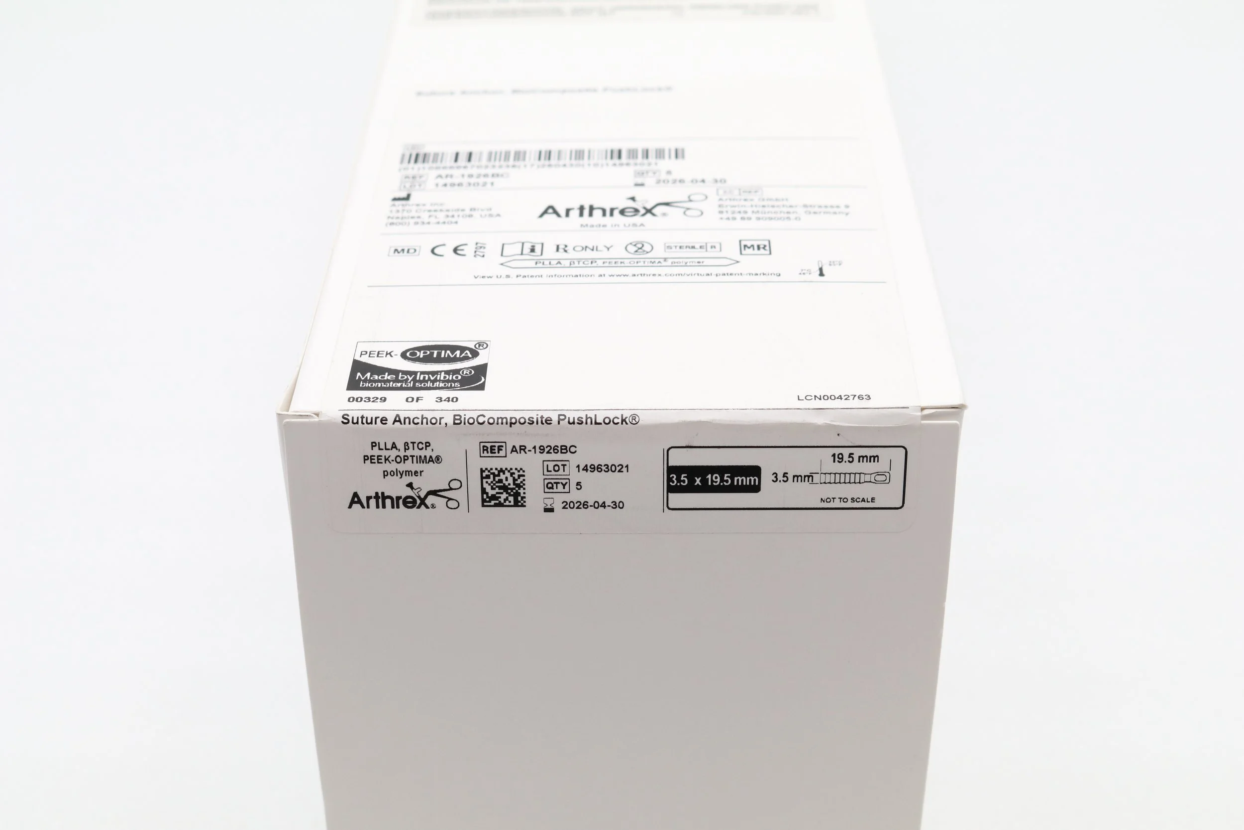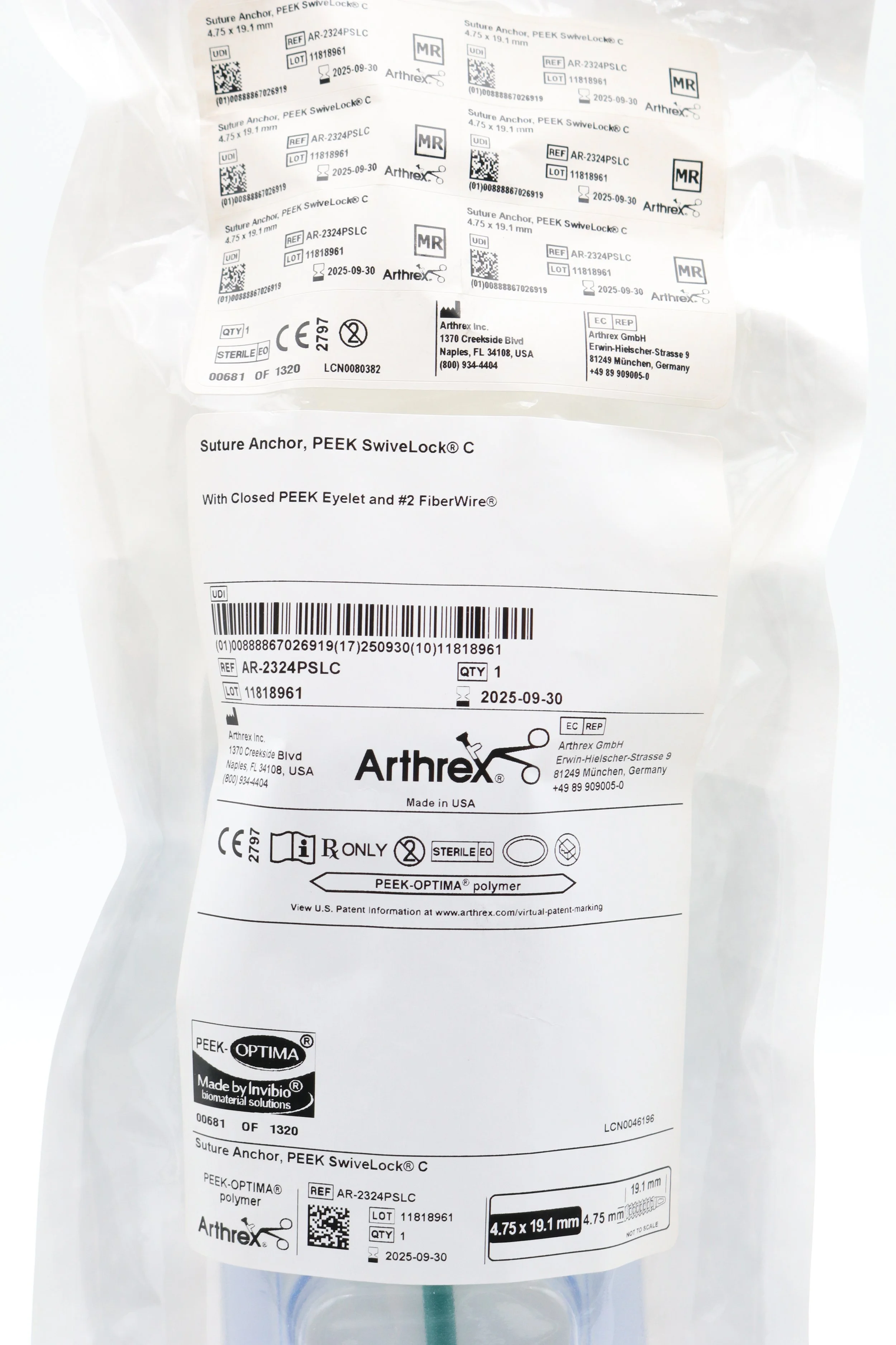 Arthrex | AR-2324PSLC | Eaches | Suture Anchor PEEK SwiveLock C with Closed PEEK Eyelet and #2 FiberWire