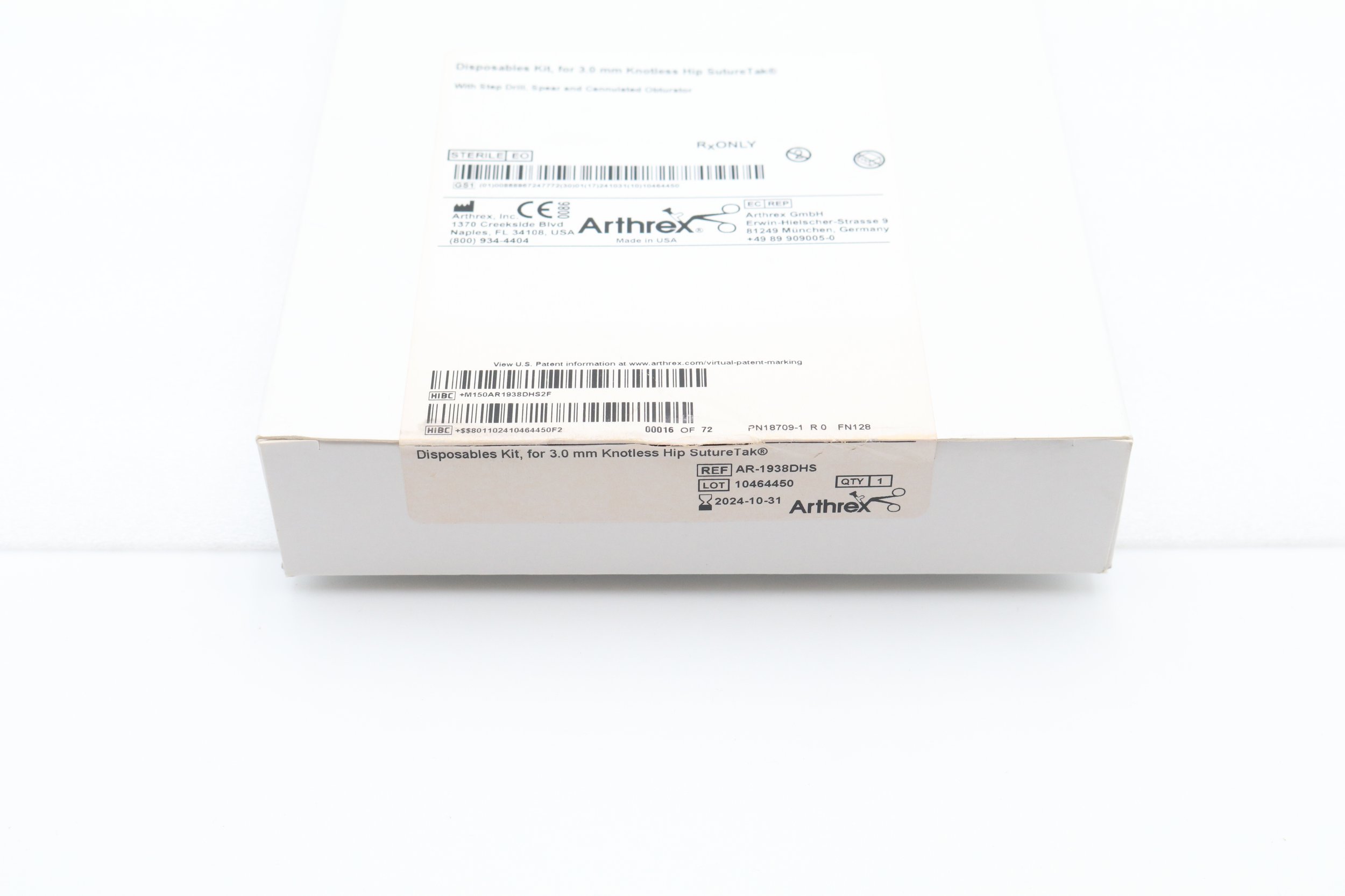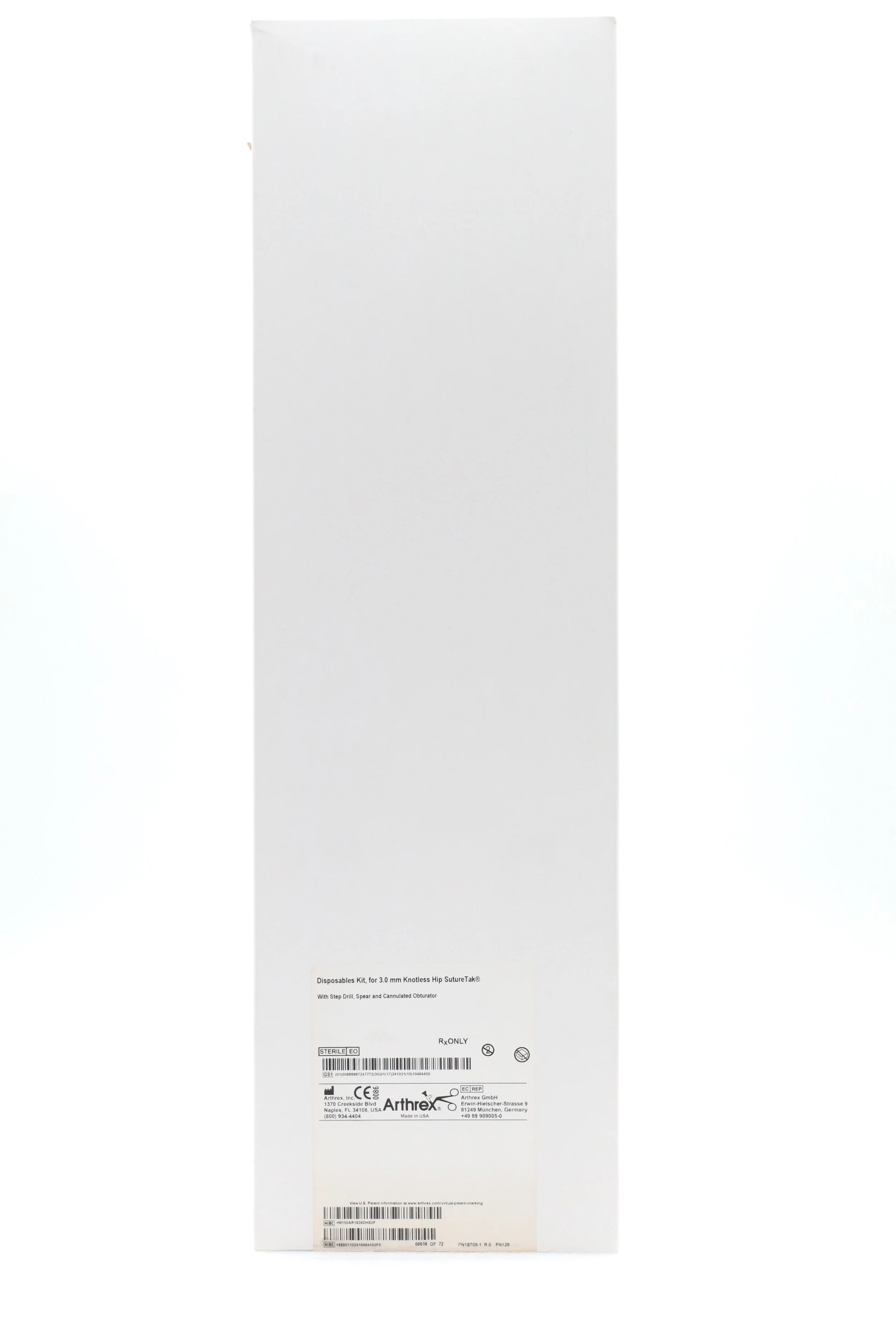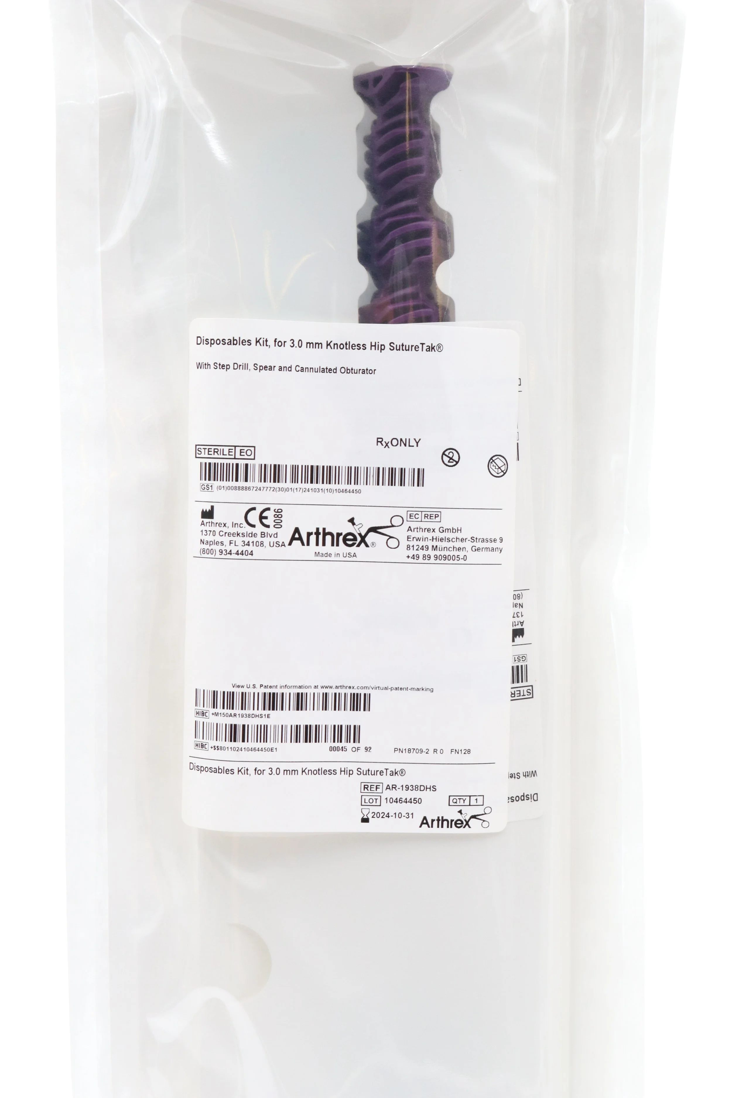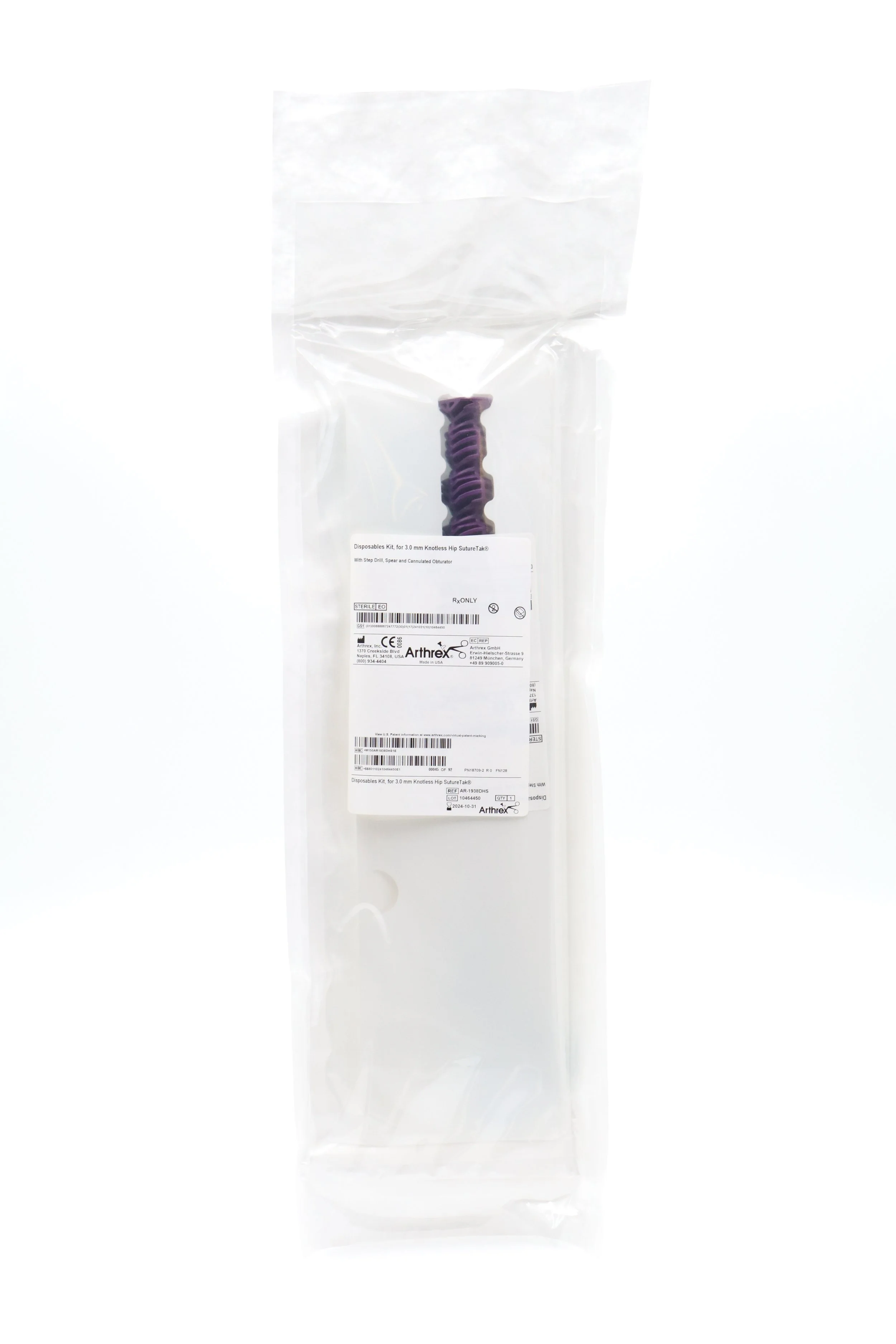 Arthrex | AR-1938DHS | Disposables Kit, for 3.0mm Knotless Hip SutureTak with Step Drill, Spear and Cannulated Obturator