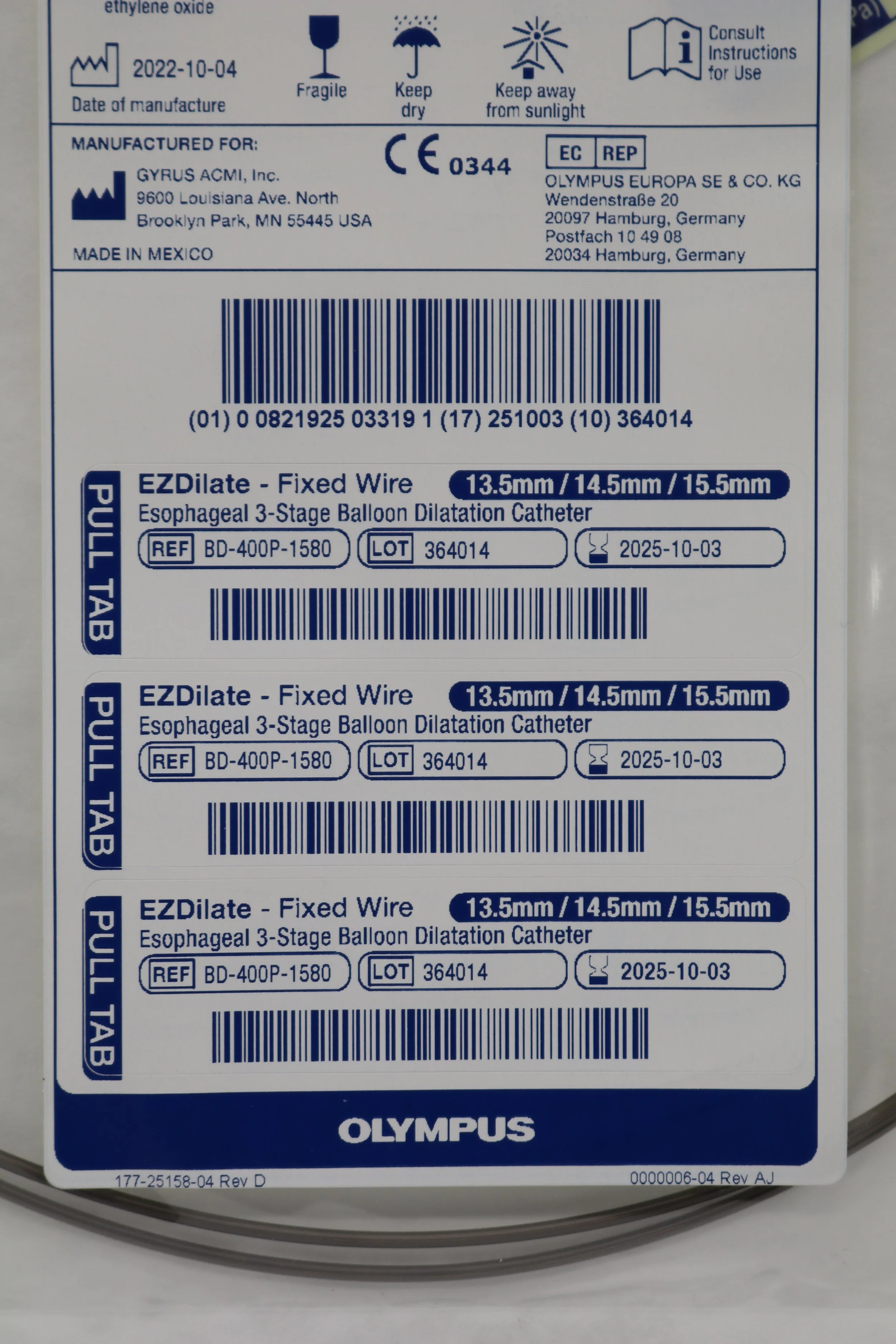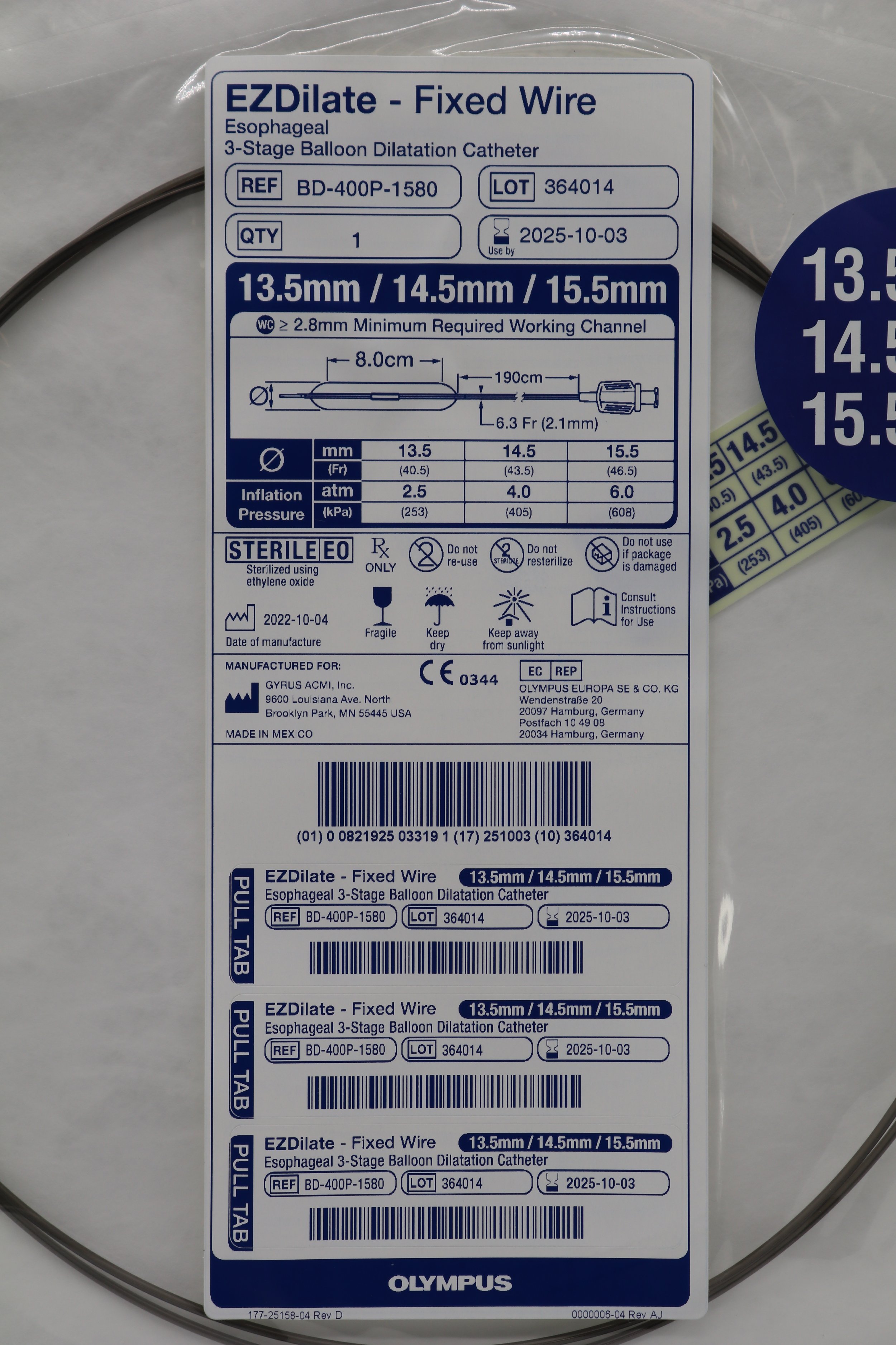 Olympus | BD-400P-1580 | EZDilate Wire Guided Esophageal 3-Stage Balloon Dilatation Catheter 13.5mm 14.5mm 15.5mm