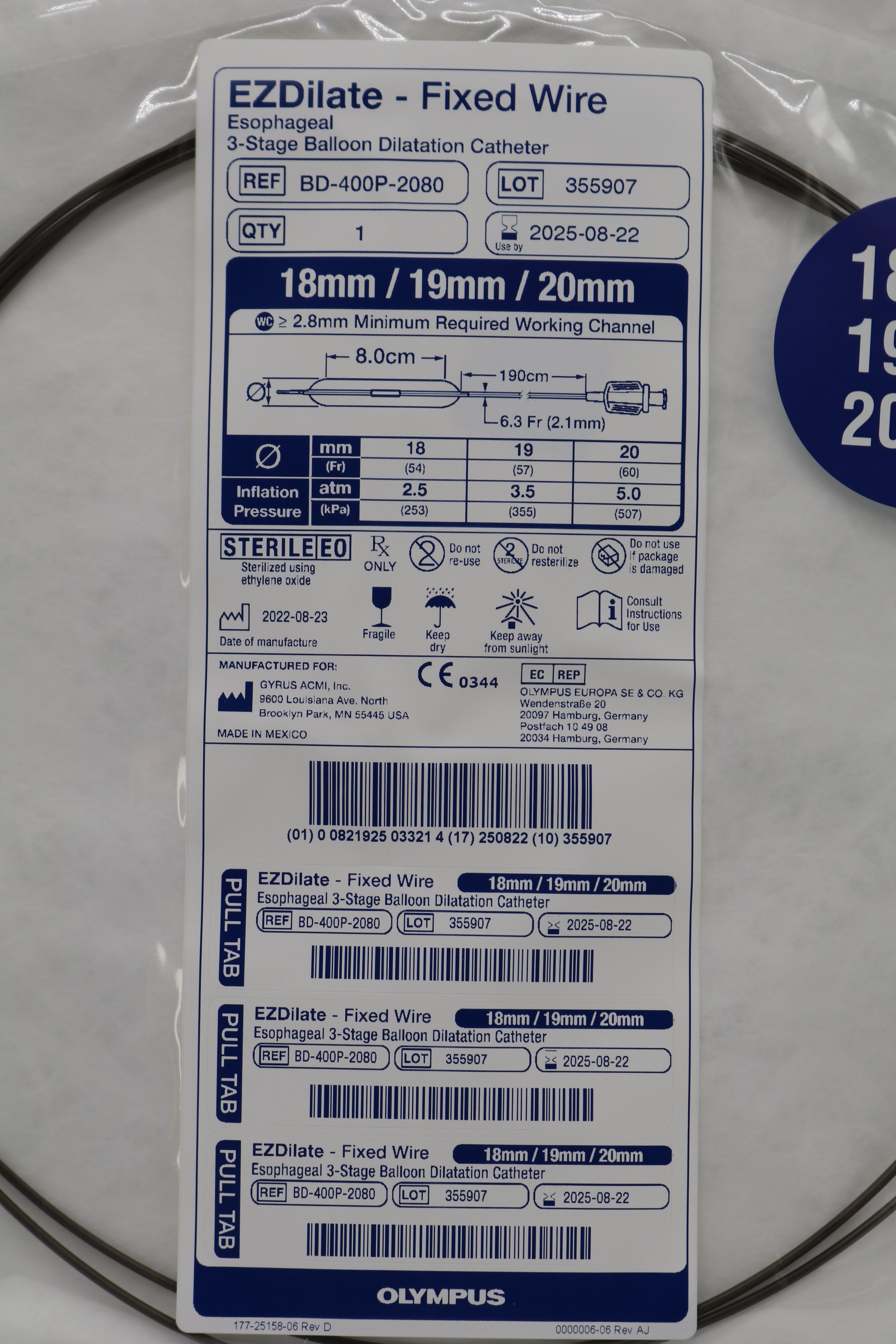 Olympus | BD-400P-2080 | EZDilate Esophageal 3-Stage Balloon Dilatation Catheter 18mm 19mm 20mm