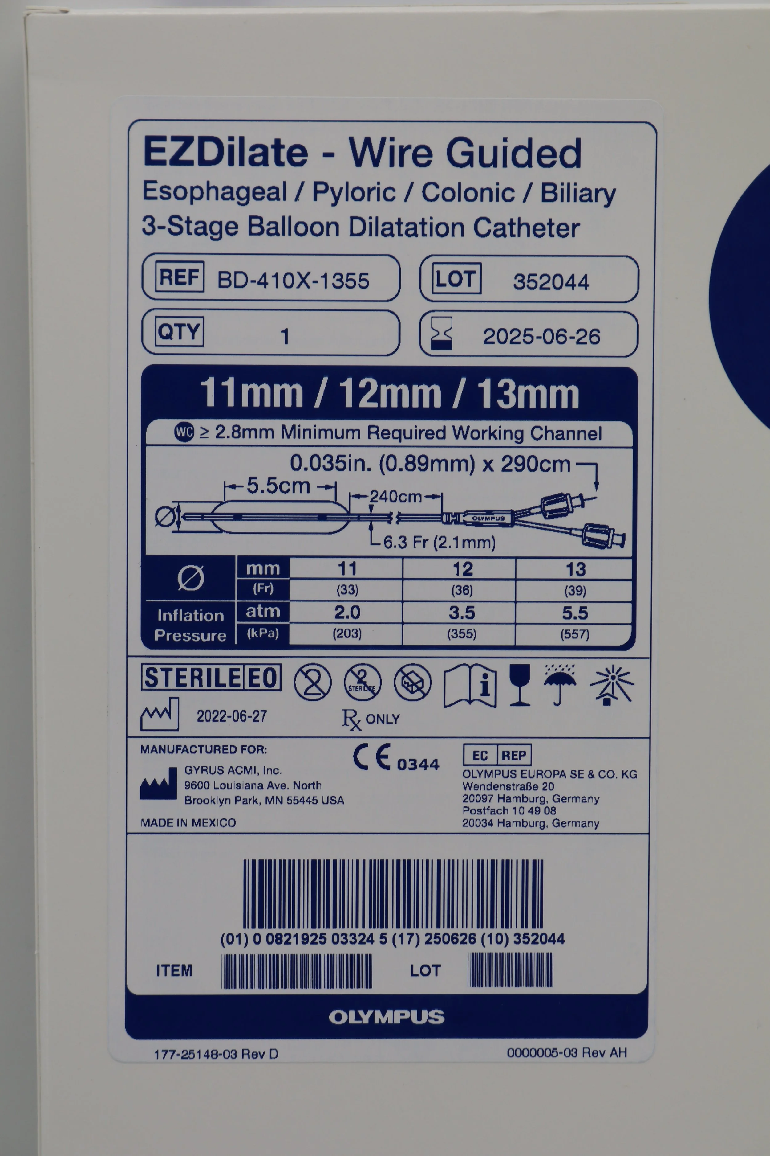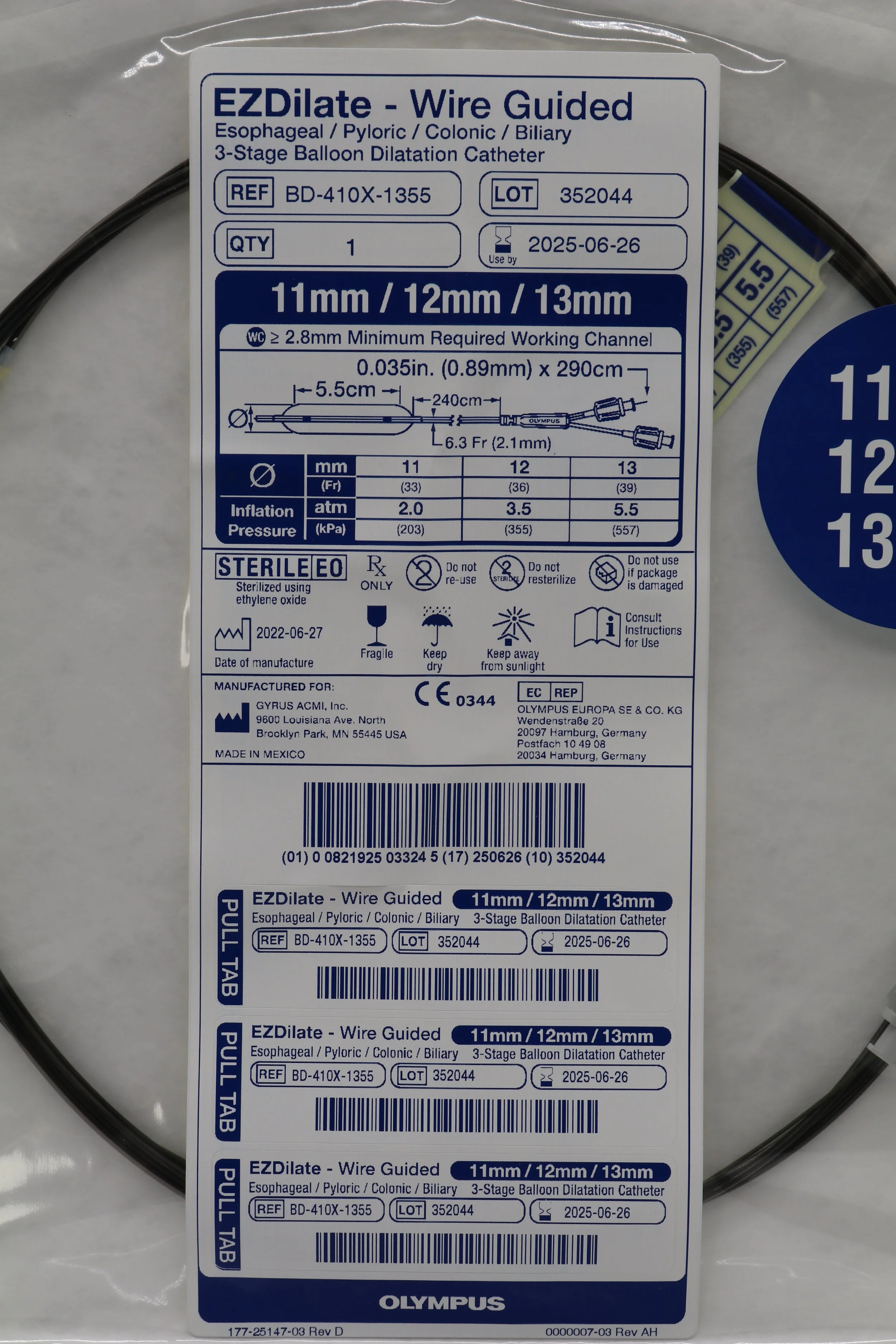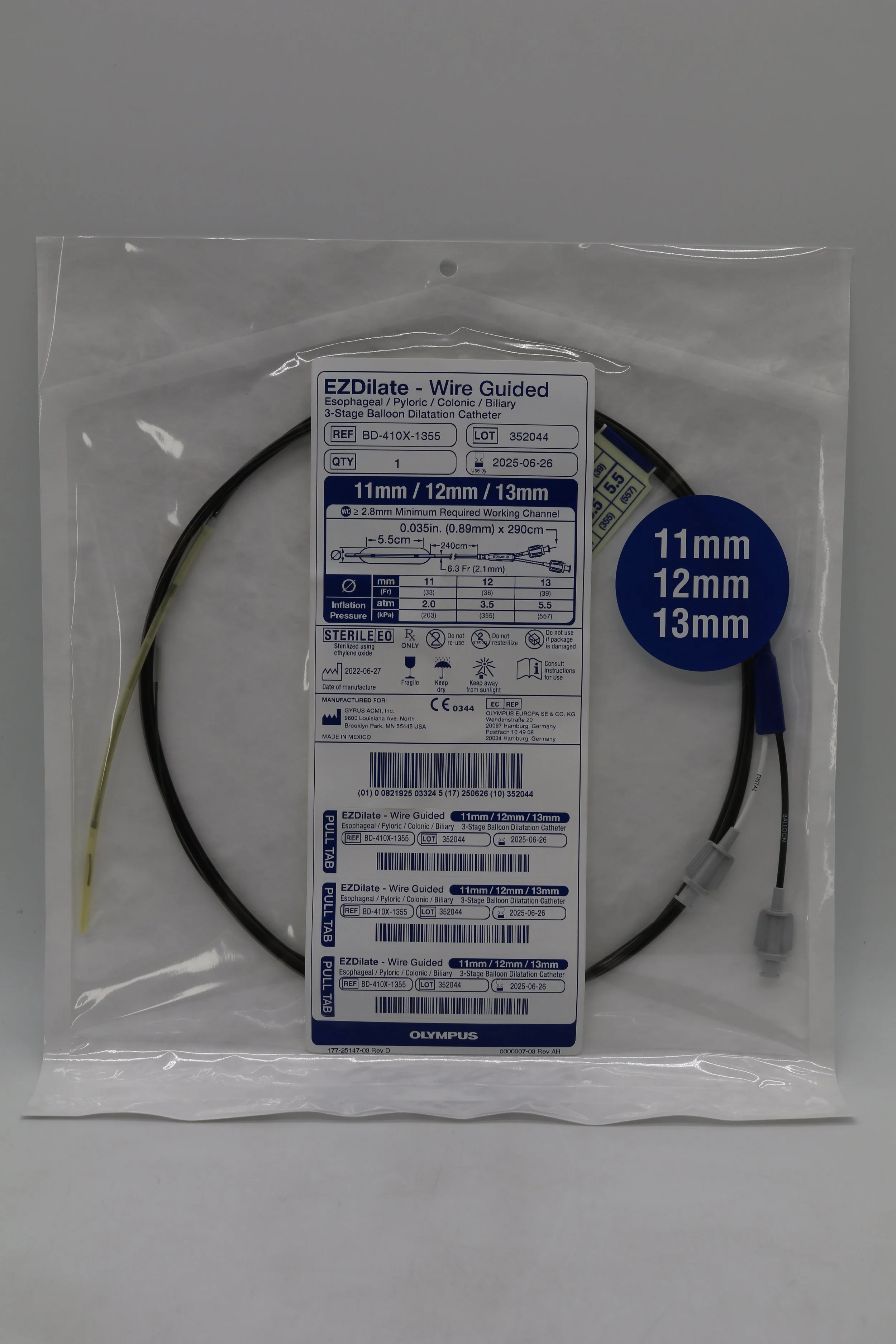 Olympus | BD-410X-1355 | EZDilate Wire Guided Esophageal Pyloric Colonic Biliary 3-Stage Balloon Dilatation Catheter 11mm 12mm 13mm