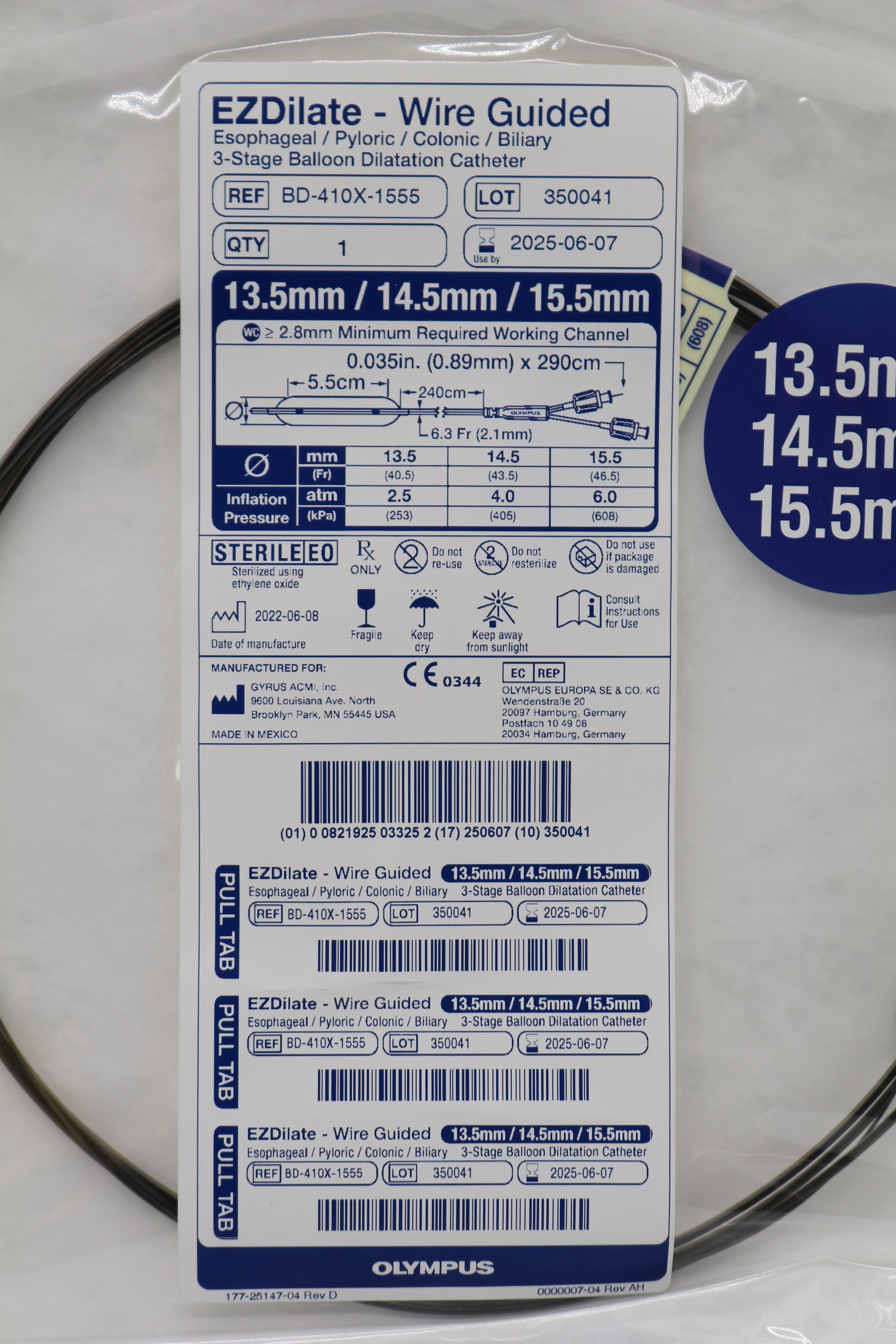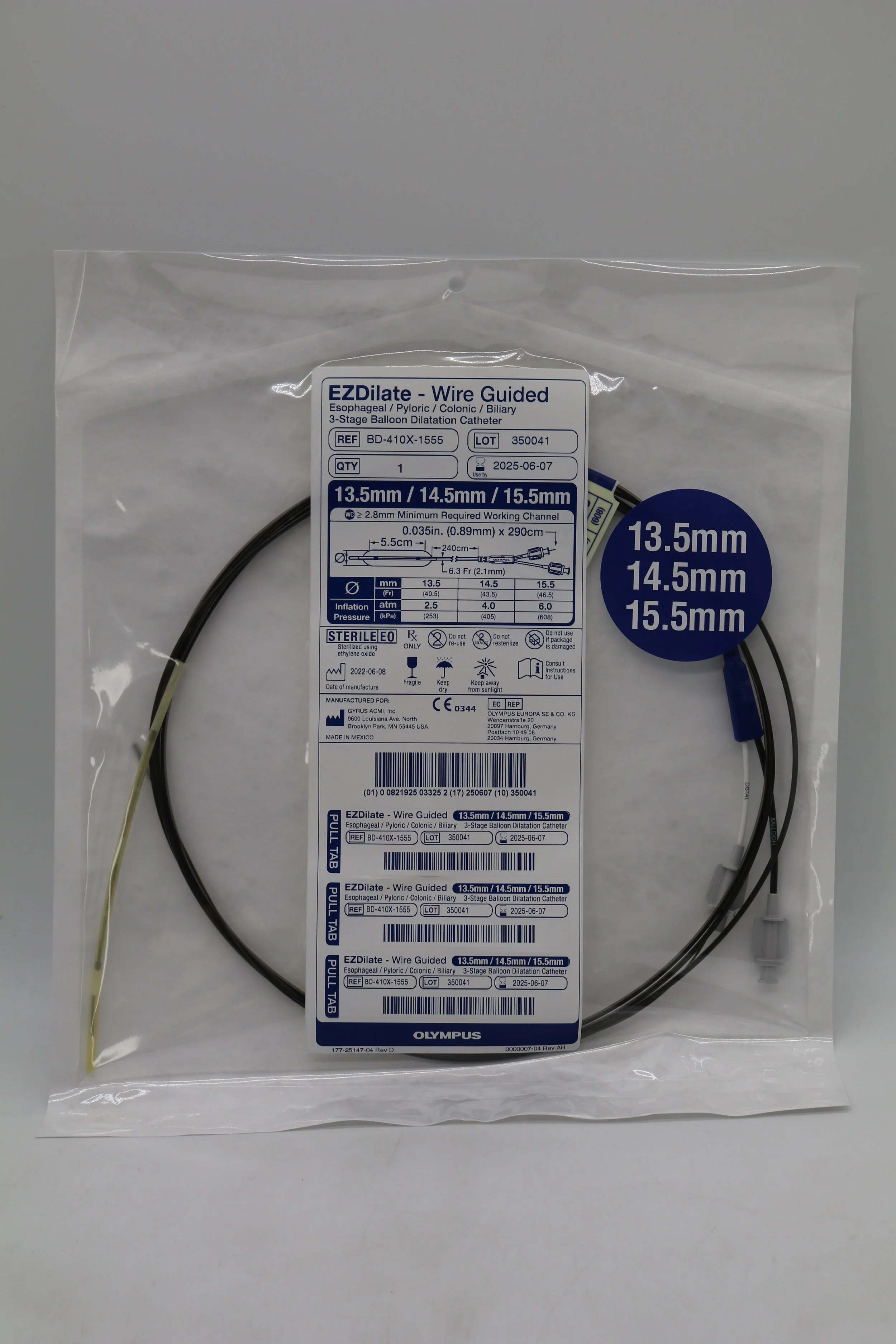 Olympus | BD-410X-1555 | EZDilate Wire Guided Esophageal Pyloric Colonic Biliary 3-Stage Balloon Dilatation Catheter 13.5mm 14.5mm 15.5mm