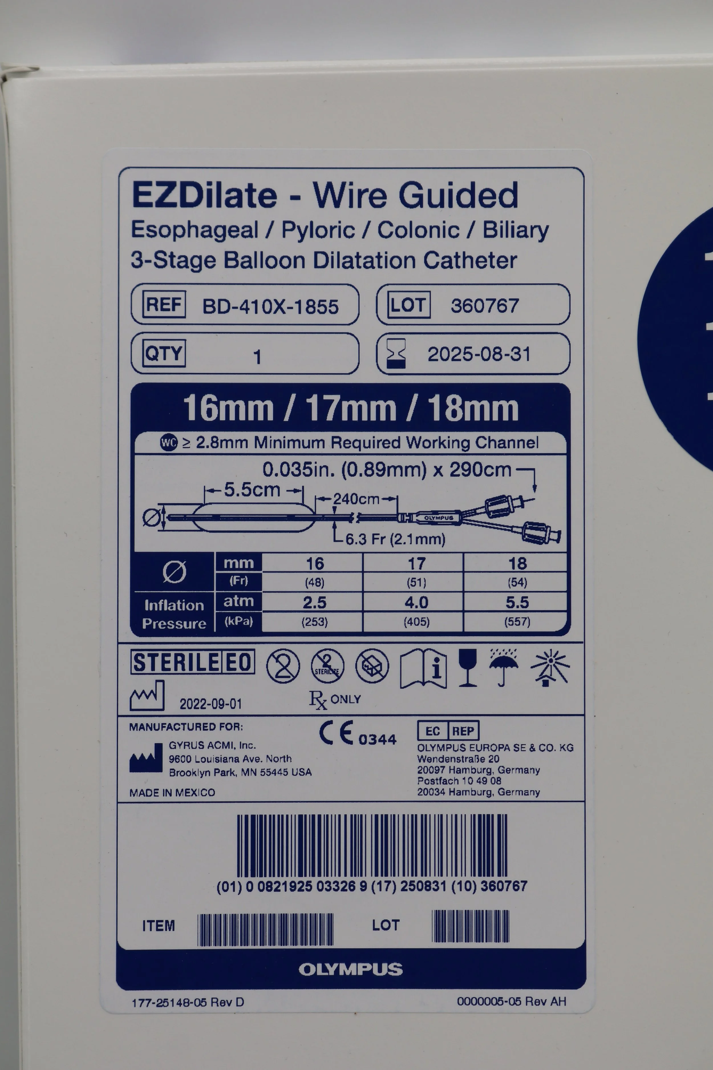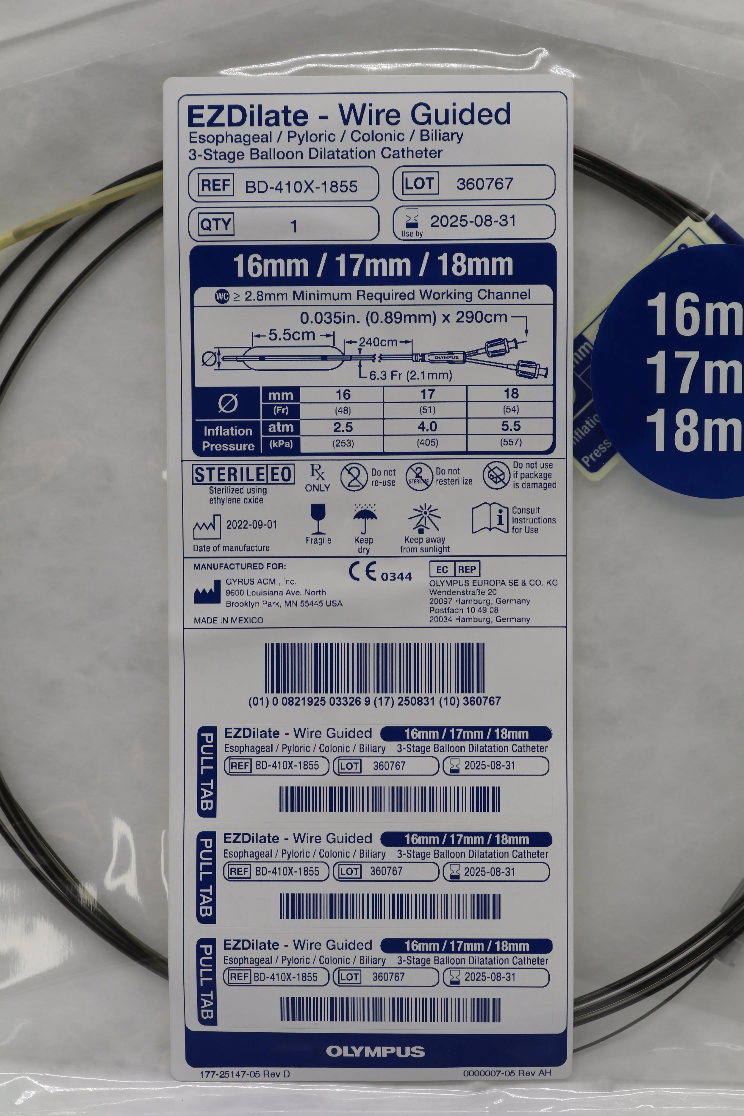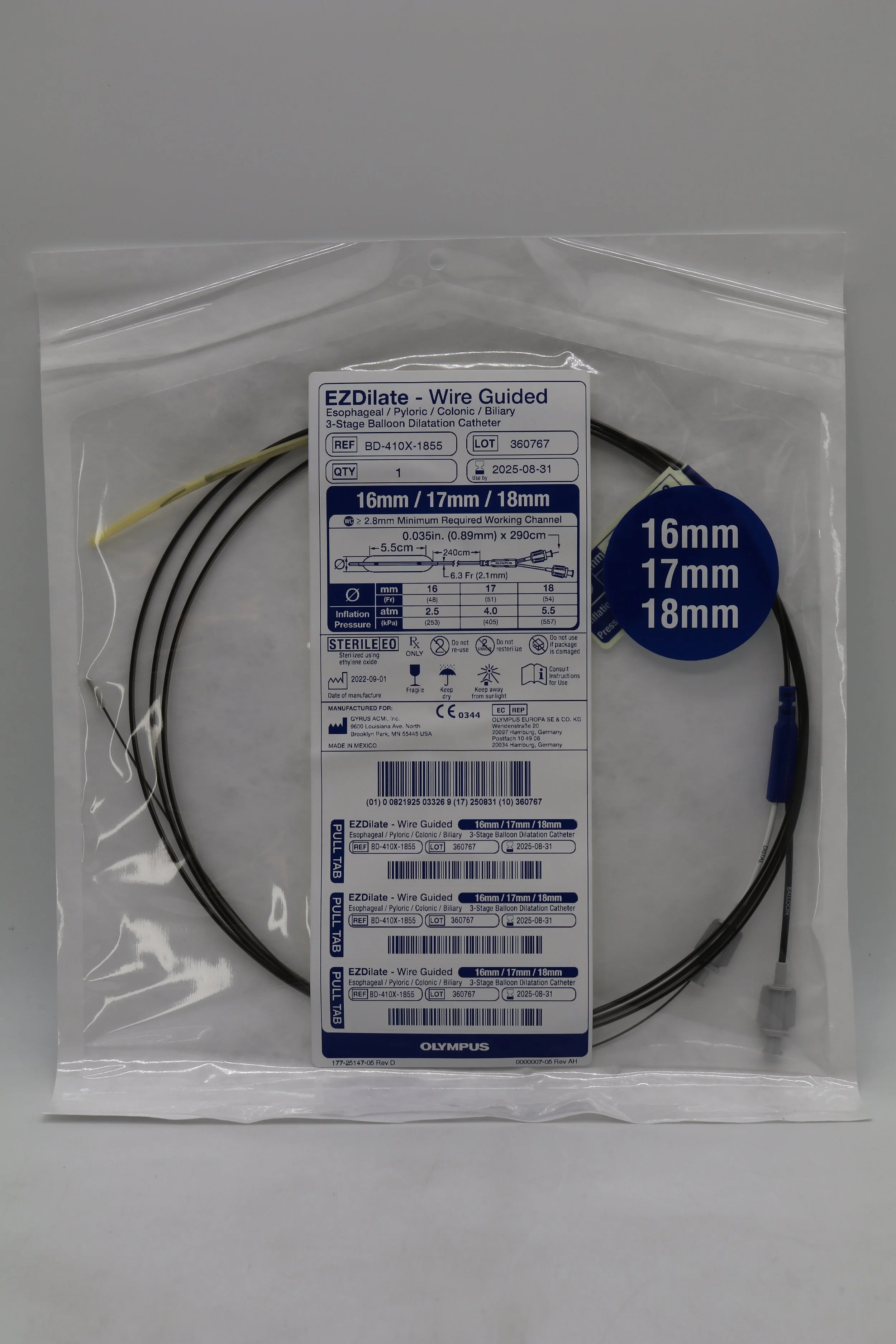 Olympus | BD-410X-1855 | EZDilate Wire Guided Esophageal Pyloric Colonic Biliary 3-Stage Balloon Dilatation Catheter 16mm 17mm 18mm