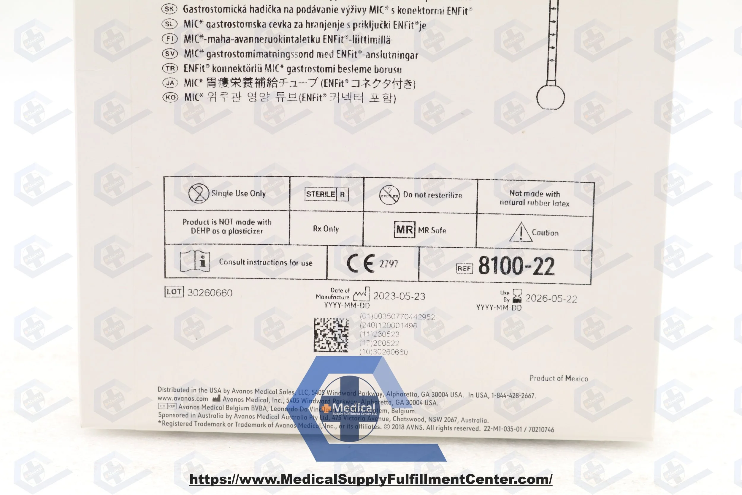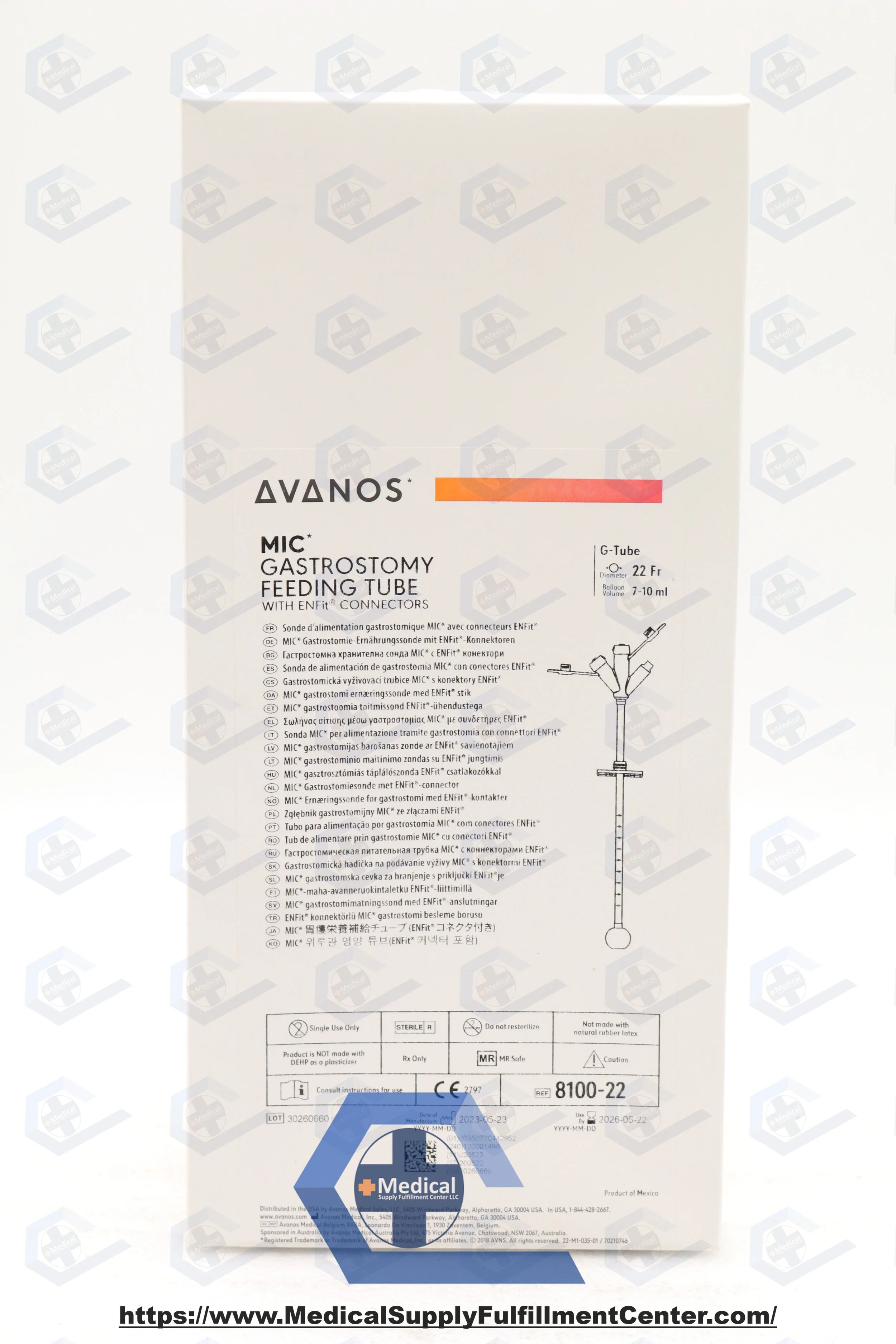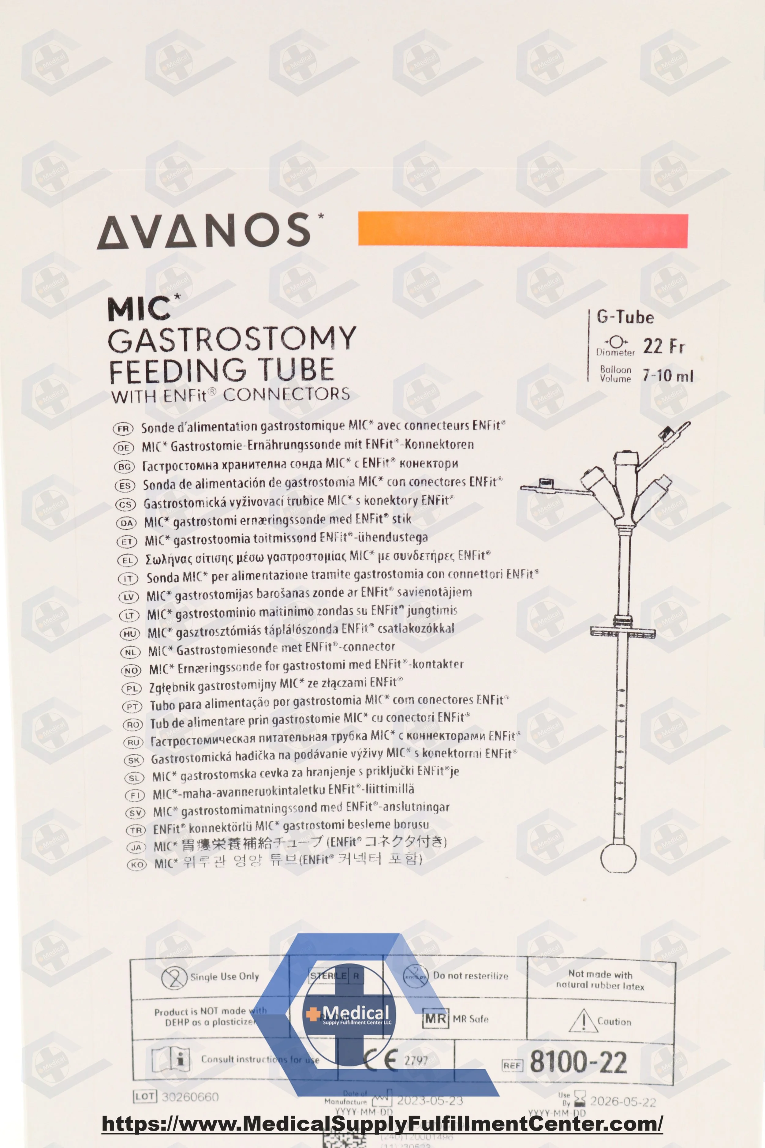 Avanos | 8100-22 | SHORT DATE | EACHES | Sterile 22 Fr silicone MIC gastrostomy feeding tube with ENFit connectors, 7–10 mL retention balloon, recessed tip, radiopaque stripe